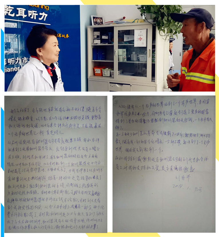 我今年65歲了。自年輕時耳朵就有毛病不好使,隨著年齡增長越來越重。聽不見在工作說話中出現(xiàn)些差錯,更愁著和人說話打交道,幾十年來各種治療都用過,不見效,像在一個無聲世界一樣。真煩人。以后聽說斯達(dá)克助聽器公司專營店效果不錯。我和老伴就來到了這家助聽器專營店,店領(lǐng)導(dǎo)劉大夫及員工在上班。劉大夫和我講了有關(guān)助聽器的好處及各方面的情況,心中有些半信半疑,加上當(dāng)時配一個助聽器就得花四千元,當(dāng)時感覺經(jīng)濟(jì)條件緊張。不想在這花了??晌依习闉榱艘院舐犃φ娴南駝⒋蠓蛑v的那樣,抱著一種好比這筆錢丟了,和劉大夫辦了配制助聽器的手續(xù),同時做了檢查造型方面的過程和安排。當(dāng)時兩個耳朵都配了,按公司規(guī)定像我這種形狀的助聽器得花八千以上才給配,當(dāng)時劉大夫看我確實情況不好,從各方面手續(xù)減免一部分。兩個花了六千多元就配成了。當(dāng)時配的時間是2010年秋天到2017年秋天在7年左右時間中助聽器沒有大的故障出現(xiàn)。同時聽力上無論工作辦事和人的交往上,都能和他們大膽的辦事了。