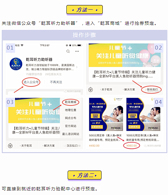 為此,在兒童節(jié)到來之際乾耳聽力聯合瑞士峰力推出專門為聽損兒童設計的助聽器—全新M平臺美人魚助聽器。 您可以通過以下兩種方式來購買“預定券”。 嬰幼兒的聽力損失 是全世界都在關注的問題。 關注兒童聽力健康, 乾耳聽力一直在行動。 |