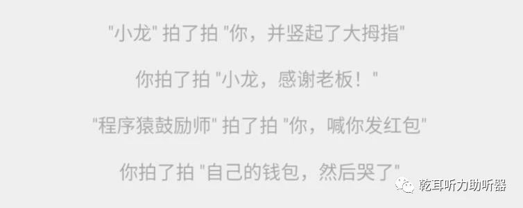 前不久 微信升級(jí)帶來的“拍一拍”功能 引發(fā)了一大波熱潮 當(dāng)你雙擊好友頭像的時(shí)候 頭像除了會(huì)抖動(dòng) 還會(huì)出現(xiàn) “你拍了拍xxx ”的提醒 如果對(duì)方也是最新版本的話 也能收到這個(gè)提醒哦 而最近 小乾又雙叒叕 發(fā)現(xiàn)了 微信“拍一拍” 可以加后綴 于是就被網(wǎng)友玩壞了: 乾耳聽力 拍了拍你 告訴你:何時(shí)何地選配適合的助聽器? 首先讓乾耳聽力師帶您了解一下 聽力損失的日常表現(xiàn): 當(dāng)您和別人交流的時(shí)候,是否經(jīng)常要求對(duì)方“再說一遍”? 您是否常覺得別人講話聲音小,要求對(duì)方“大聲點(diǎn)”? 當(dāng)您看電視的時(shí)候,是否一定要把電視機(jī)的音量調(diào)的很大才能聽清? 當(dāng)您背對(duì)著別人的時(shí)候,就聽不清別人說的話? 是否常有人說您講話聲音太大? 您打電話是否經(jīng)常聽不清電話的內(nèi)容? 您是否常感到小孩和女性的說話聲特別難以聽清? 您是不是對(duì)鳥叫、鐘表嘀嗒聲和門鈴聲感知困難? 您與人交談是否經(jīng)常出現(xiàn)打岔的現(xiàn)象? 您長時(shí)間傾聽和交談是否覺得疲倦? 幾個(gè)人一起說話時(shí),您是否常跟不上別人的談話? 如果您或您的家人出現(xiàn)上述癥狀,可能已經(jīng)出現(xiàn)聽力損失,請(qǐng)放下手中的工作,到乾耳聽力驗(yàn)配中心檢查聽力狀況。 從理論上來講,不論單側(cè)還是雙側(cè)聽力減退,無論是傳導(dǎo)性還是感音神經(jīng)性耳聾,只要聽力障礙影響日常生活,影響語言發(fā)育,并且不能經(jīng)藥物或手術(shù)方法加以矯正,都是需要佩戴助聽器的。選戴助聽器更好在驗(yàn)配師指導(dǎo)下進(jìn)行,應(yīng)先檢查老人聽力,根據(jù)情況選擇適合的、性價(jià)比高的助聽器。 選擇適合的助聽器能有效改善聽力下降的問題,幫助弱聽人士聽到更清晰的言語聲和環(huán)境聲,也可以幫助阻止大腦的進(jìn)一步退化。除此之外,助聽器還能幫助弱聽人士重新訓(xùn)練一些重要的聆聽技能,例如聆聽周圍的聲音、遠(yuǎn)處的聲音、不同方向的聲音。 所以 乾耳聽力 “拍一拍”提醒你: “助聽器該選我還得選我啊”您值得信賴的選擇~ |