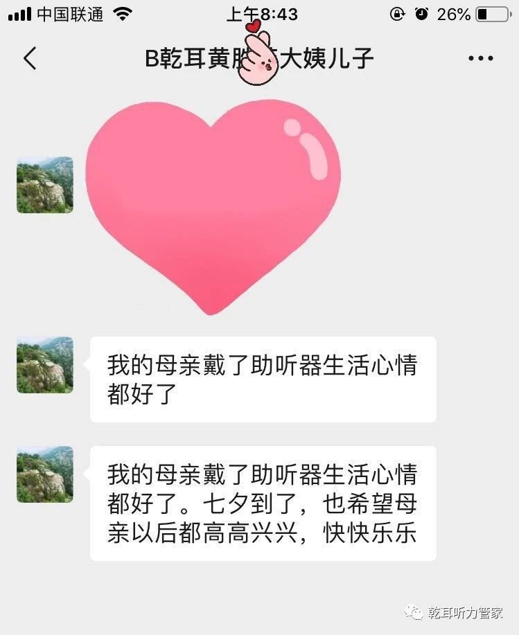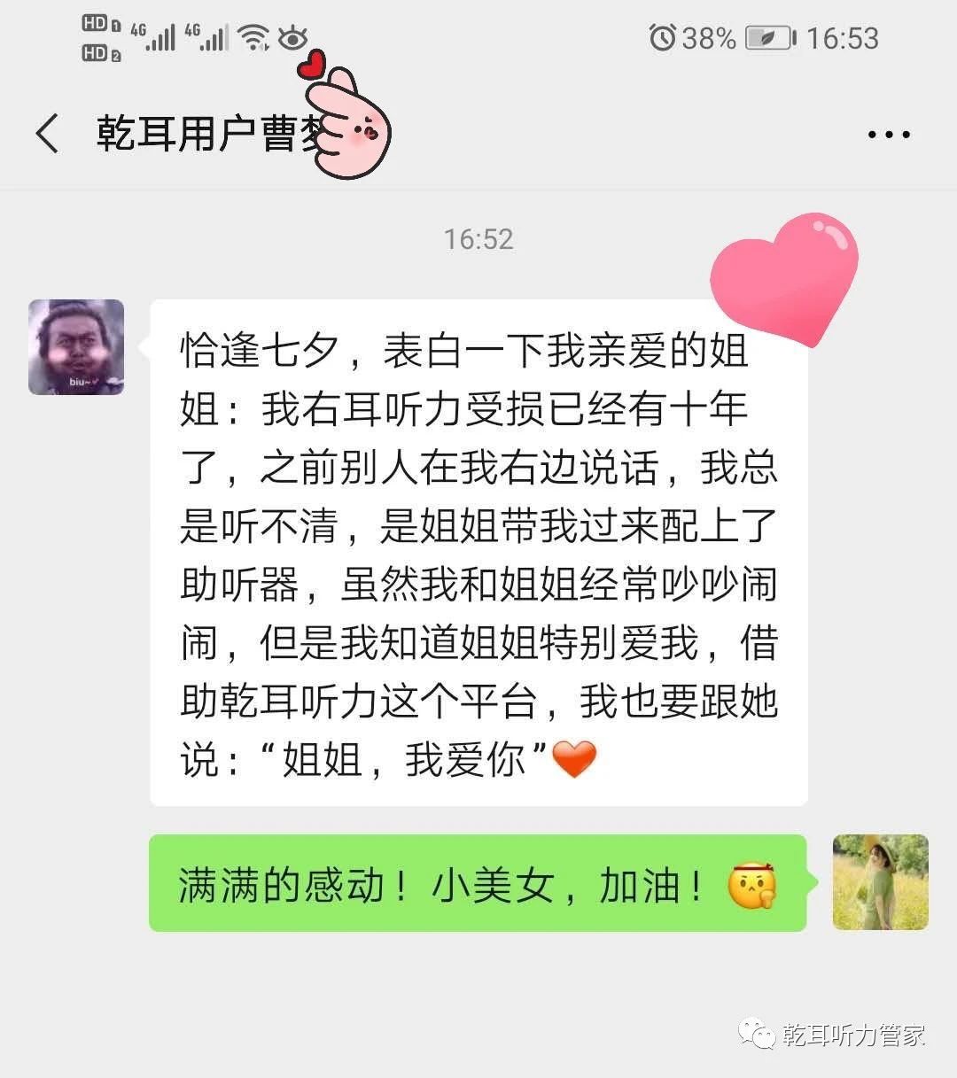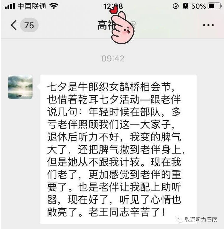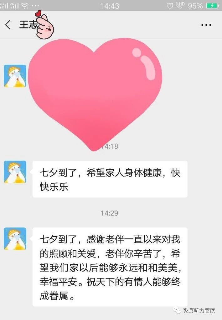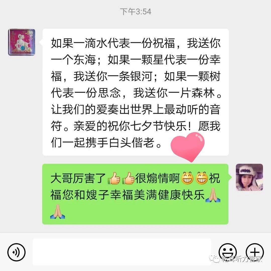 “牛郎織女”的傳說(shuō) 是每個(gè)人的童年記憶 每逢七夕 我們都會(huì)再次回味這個(gè)故事 不論年齡 其實(shí)每個(gè)人都有童話情節(jié) 因?yàn)槲覀兿蛲篮玫氖挛?/span> 七夕 七夕節(jié)如今又叫做中國(guó)情人節(jié),被賦予了象征愛(ài)情的意義,成為一個(gè)極具浪漫色彩的日子,代表了不離不棄,珍惜情緣,白頭偕老這樣的情感承諾。我們通過(guò)這個(gè)節(jié)日表達(dá)婚姻幸福,家庭美滿,孩子平安健康的美好祝愿。乾耳聽(tīng)力與聽(tīng)友們一起為親友送上祝福! 您有一封情書(shū) 高大叔對(duì)老伴的“深情告白” 黃阿姨兒子和母親的“舐?tīng)偾樯睢?/span> 王大叔對(duì)老伴的“含情脈脈” 妹妹和姐姐的“相親相愛(ài)” 李大哥和老伴的“海誓山盟” 蘭大叔和老伴的“相濡以沫” 諸如此類的話還有“好多...好多...” 陪 伴 是 最 深 情 的 告 白 七夕家人相聚 乾耳聽(tīng)力也為聽(tīng)友們帶來(lái)優(yōu)惠和禮品 助您聽(tīng)得更好,享受天倫之樂(lè) 迢迢河漢下一起聽(tīng)蟲(chóng)觀星 老人們?cè)僦v起傳說(shuō)故事 我們把這樣的文化和情感代代相傳 七夕約惠,緣定一生 更快來(lái)為您愛(ài)的人搶購(gòu)吧 |