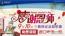 莘莘學(xué)子心,難忘恩師情,漫漫人生路,無私解惑人!教師節(jié)到了,乾耳聽力向老師道一聲:您辛苦了,謝謝您! 免費領(lǐng)電池9月10日當天只要持本人教師證及助聽器,即可免費領(lǐng)取【進口助聽器專用電池】一份。